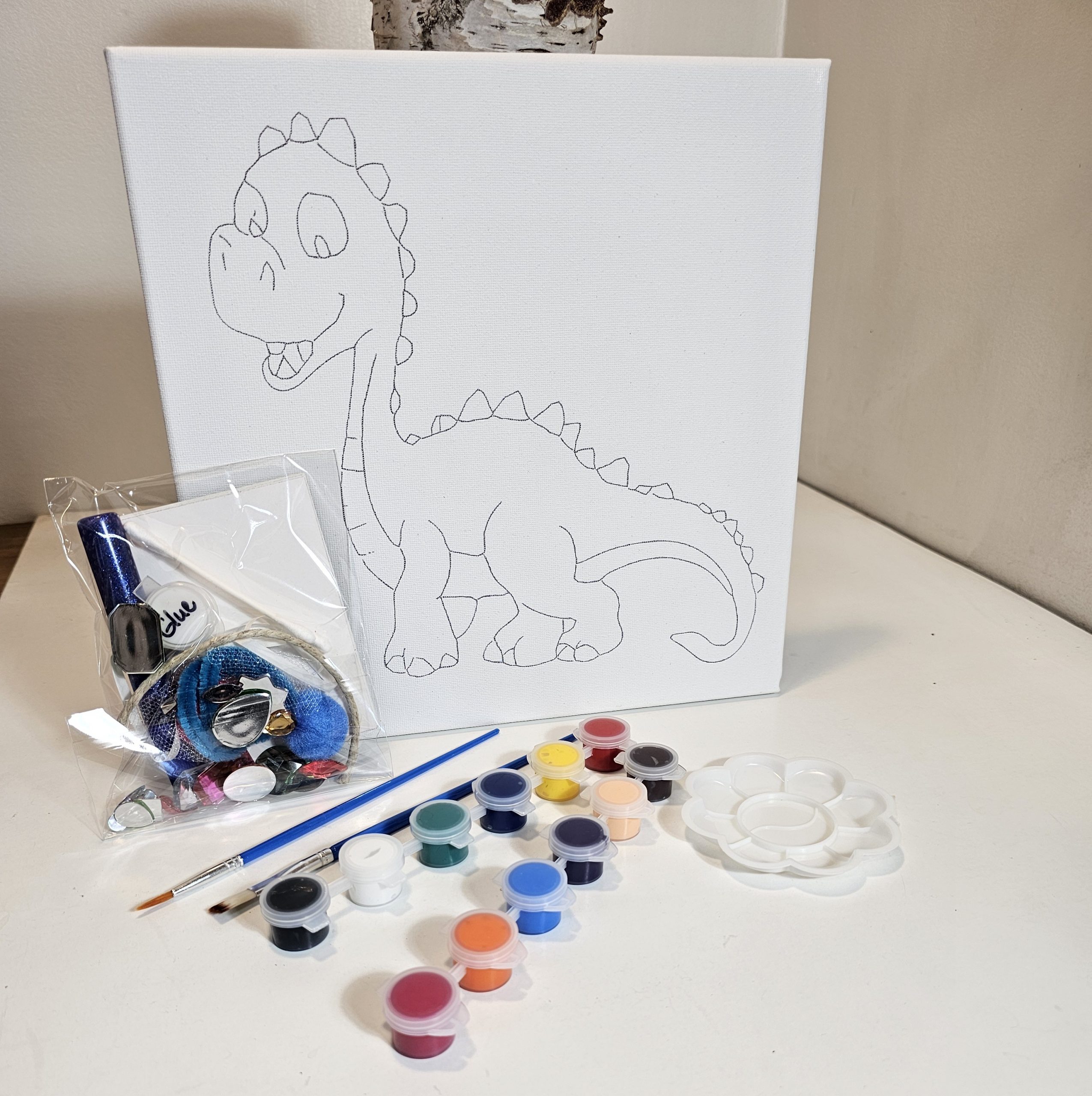 Spark your imagination with the Creative You Dinosaur Canvas Kit. This 10×10 canvas features a playful baby dinosaur standing tall in a prehistoric world—ready to be brought to life with color, creativity, and fun!