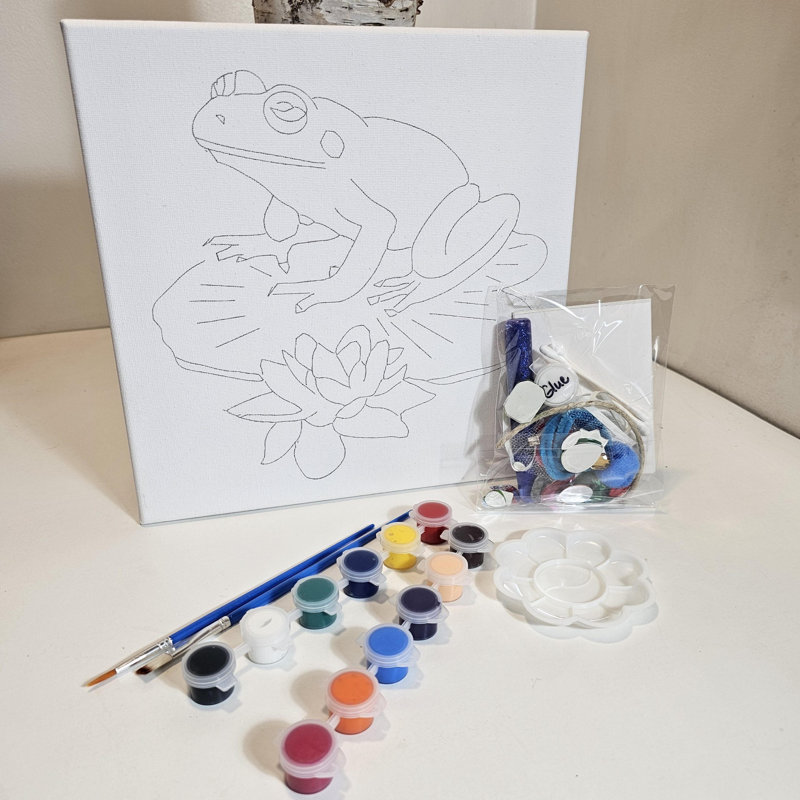 The kit includes a pre-drawn canvas, vibrant paints, glue, and fun collage elements to customize your frog-filled pond scene. It’s beginner-friendly, relaxing, and designed to invite creativity in every age group.
