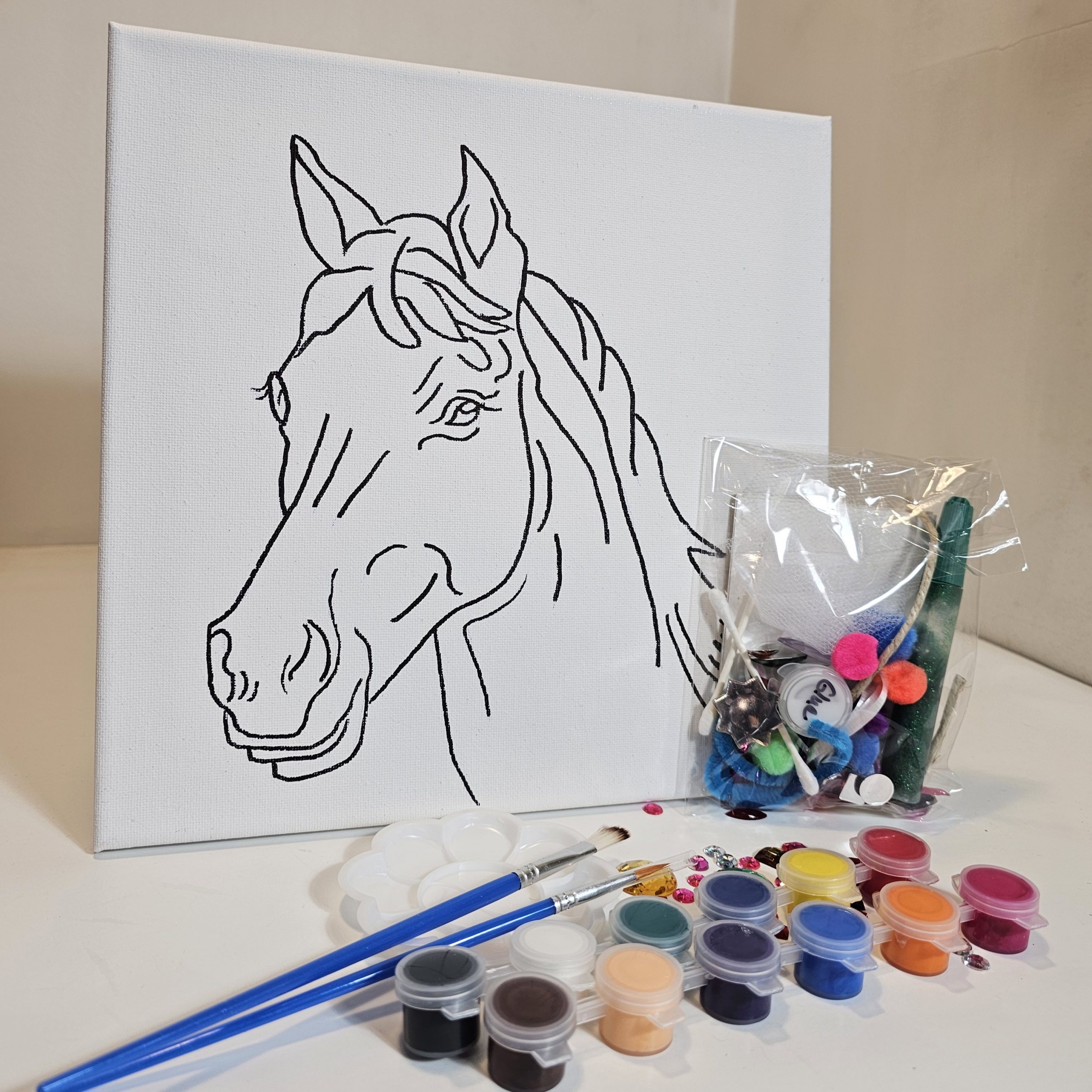 Perfect for animal lovers and young equestrians, the kit includes a pre-drawn canvas, paint set, glue, and collage items. Whether you’re crafting for fun or creating a gift for a horse-loving friend, this kit brings rustic charm to your art table.