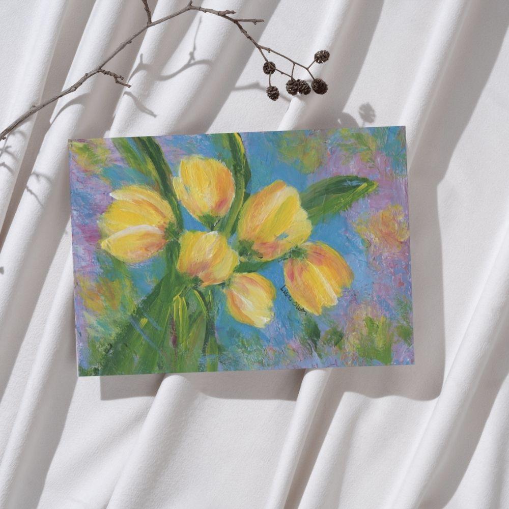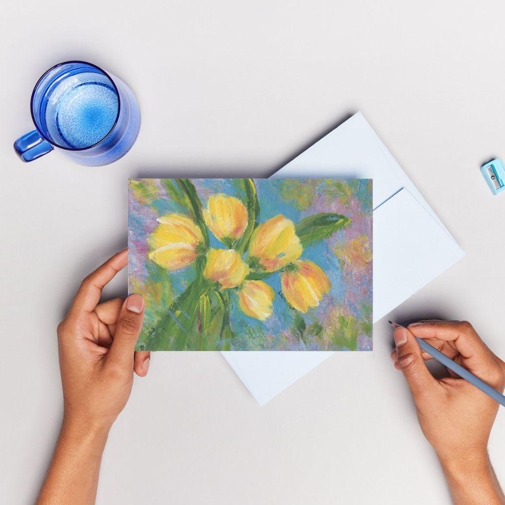 A hand-painted greeting card featuring yellow tulips. Blank inside. Includes an envelope.