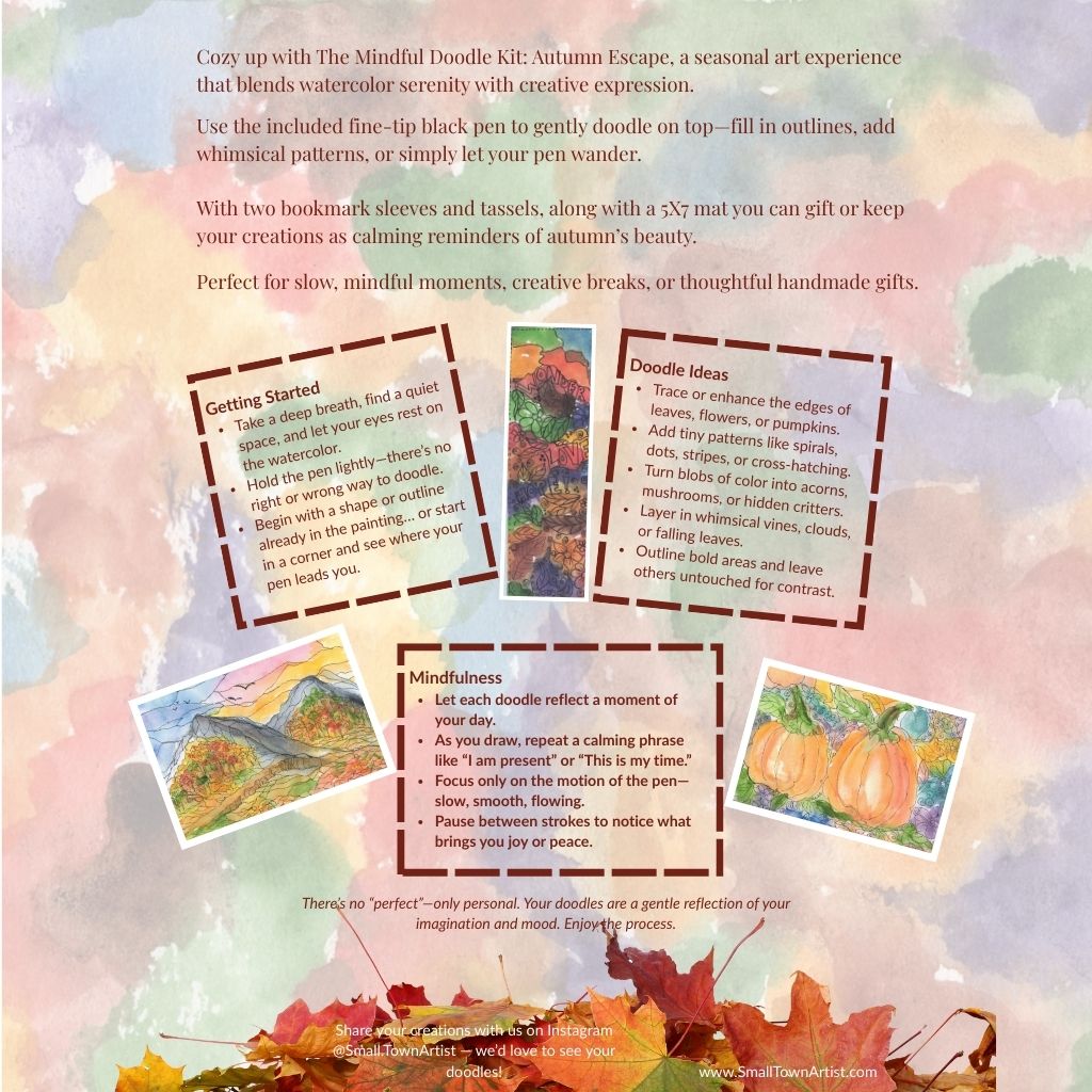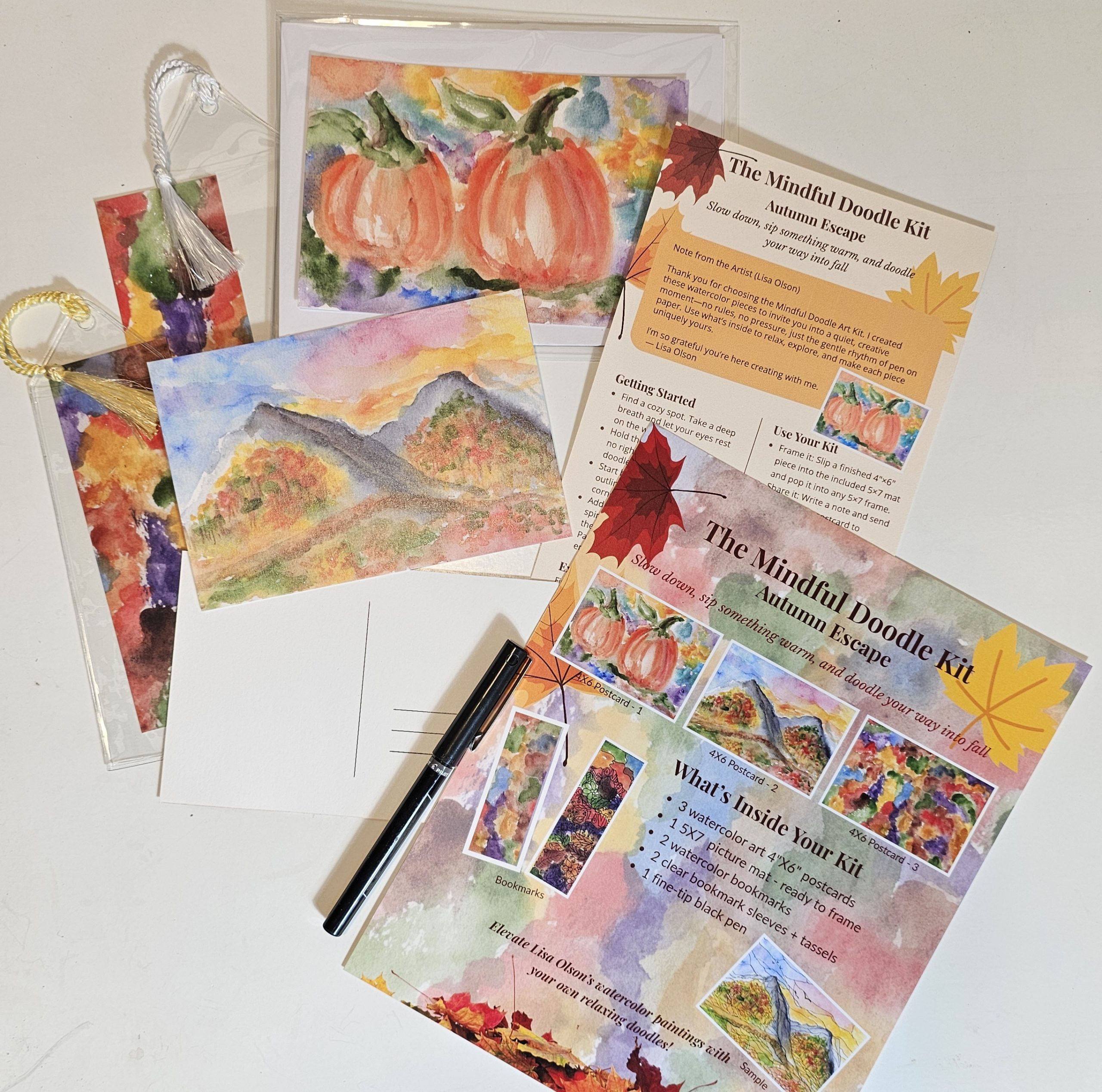 A complete autumn-themed art experience with postcards, mat, bookmarks, tassels, and pen—plus doodling tips for mindful creativity.