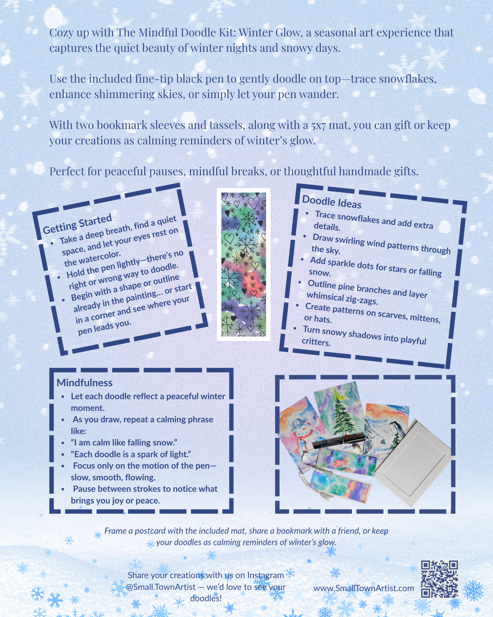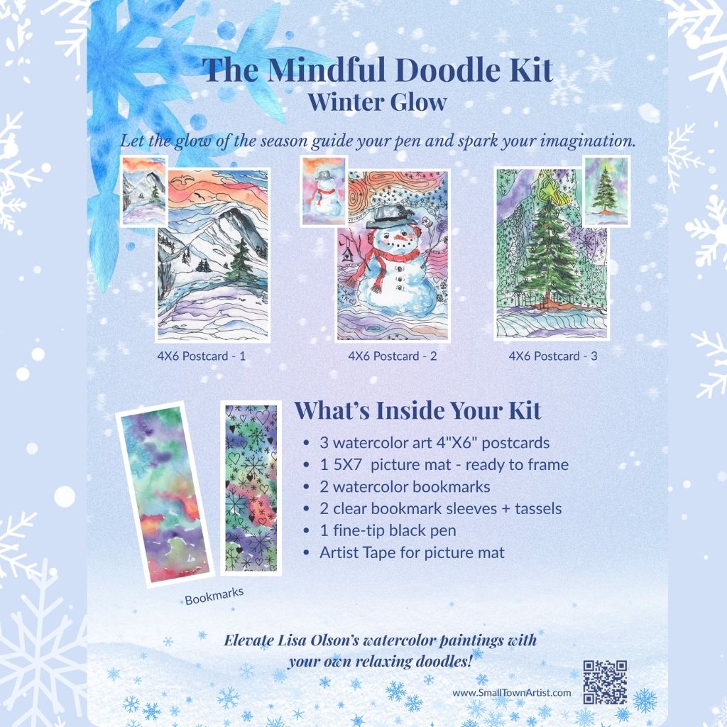 The Mindful Doodle Kit – Winter Glow is a calming, seasonal art experience designed to help you pause, reflect, and create during the quiet beauty of winter. Featuring original hand-painted watercolor artwork by Lisa Olson, this kit invites you to gently doodle, trace, and embellish—transforming each piece into a one-of-a-kind work of art.